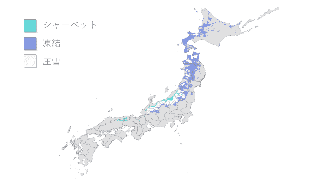 冬季における路面の凍結状況を「凍結なし」「シャーベット」「凍結」「圧雪」の4つに分類し、1kmメッシュという高解像度で1時間毎に39時間先までの予測を提供いたします。車両のスリップ事故や歩行時の転倒事故のリスクなど、目的地までの道路路面状況を確認する際などにご利用いただけます。
