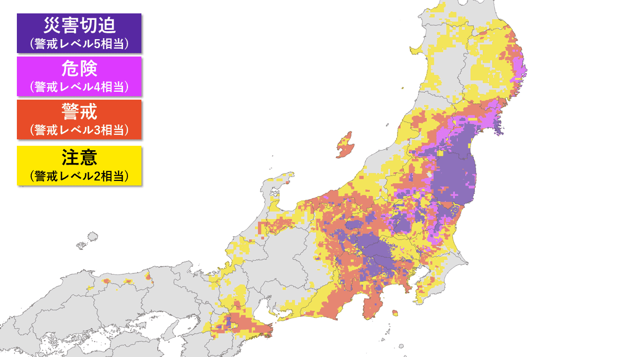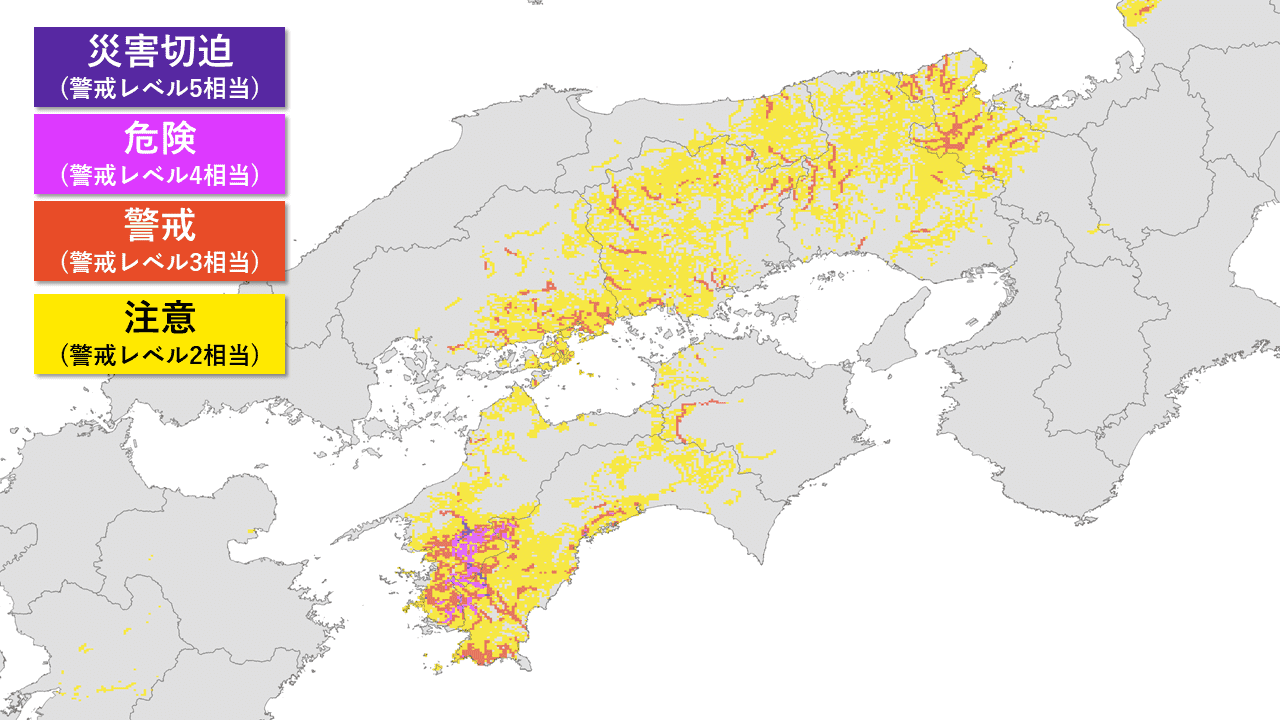気象庁によって、大雨による土砂災害発生の危険度の高まりを、地図上で1kmメッシュ毎に5段階に色分けして示す情報です。10分毎の高頻度で更新され、大雨警報(土砂災害)や土砂災害警戒情報等が発表されたときに、どこで危険度が高まっているかを把握することができます。