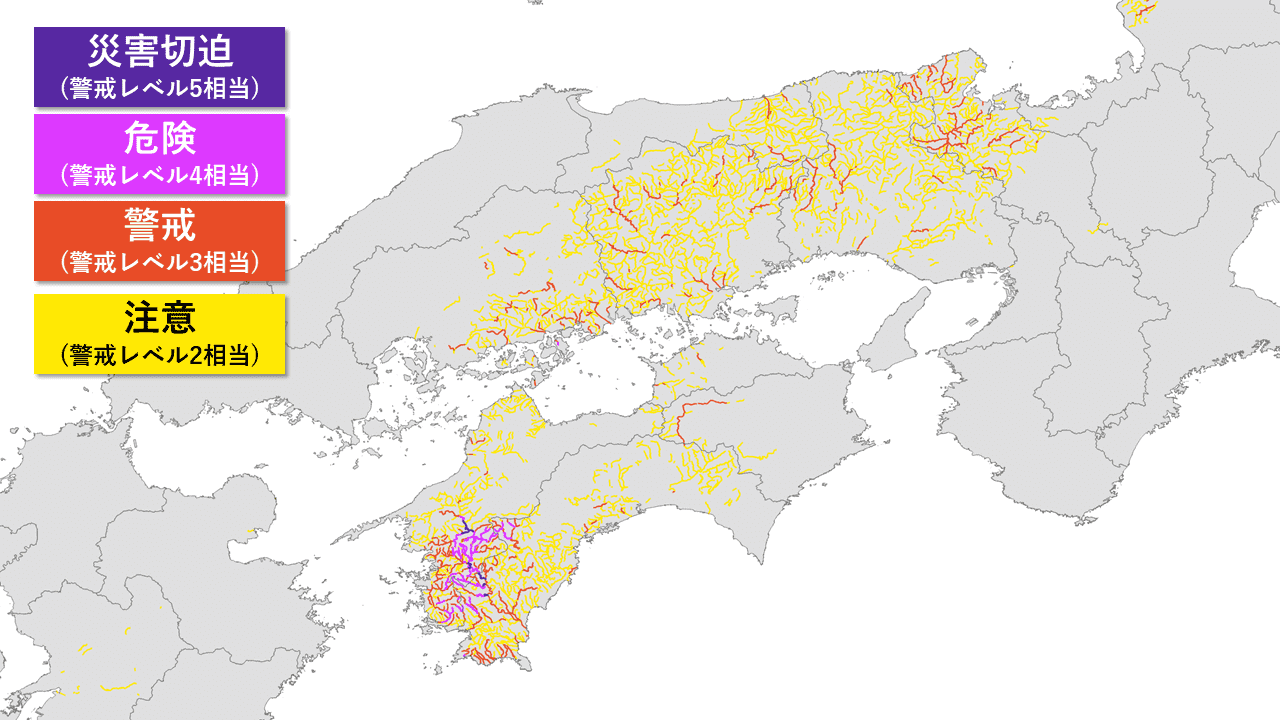 気象庁によって、大雨による中小河川(水位周知河川及びその他河川)の洪水災害発生の危険度の高まりを5段階に色分けして地図上に示したものです。中小河川の急激な増水による危険度の高まりを事前に確認することができるほか、大河川で洪水のおそれがあるときに発表される指定河川洪水予報や国管理河川の洪水の危険度分布(水害リスクライン)について表示しており、中小河川の洪水危険度とあわせて確認することができます。