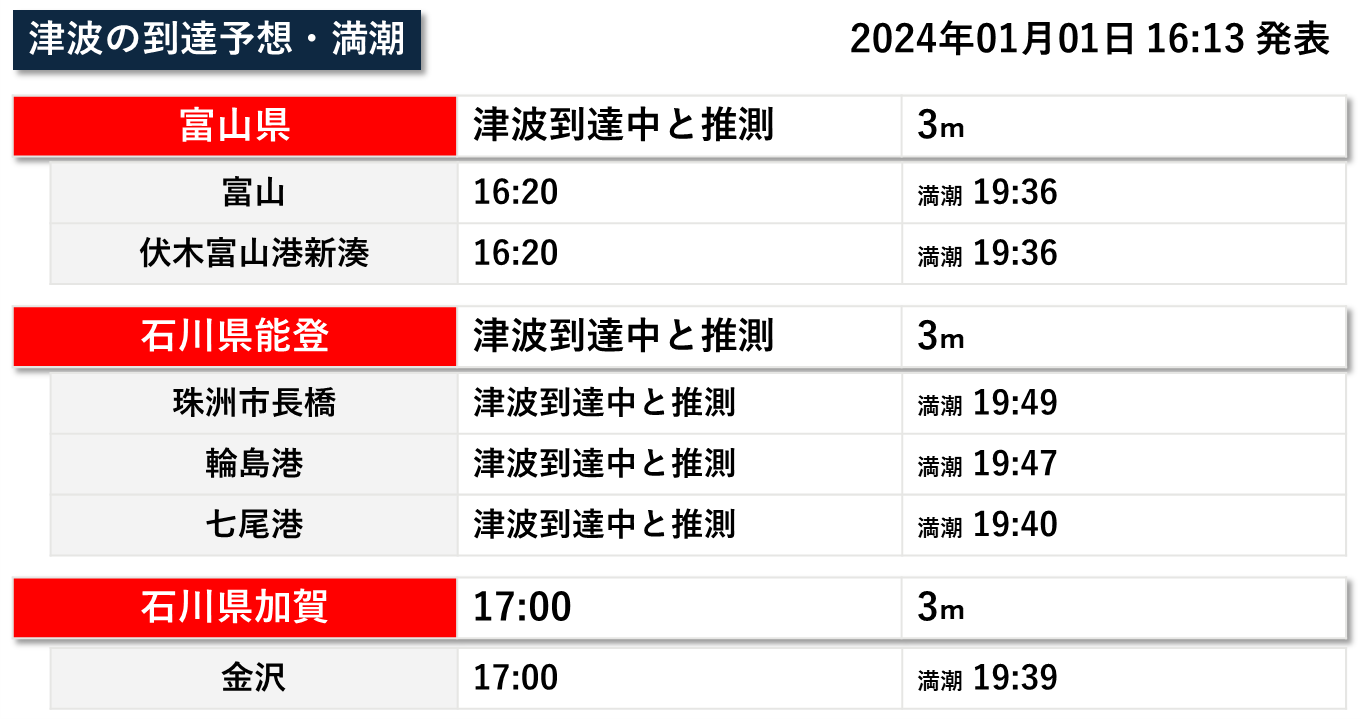 気象庁から津波警報・注意報が発表された場合、津波到達予想時刻や予想される津波の高さ、各地の満潮時刻、津波観測に関する情報を提供いたします。