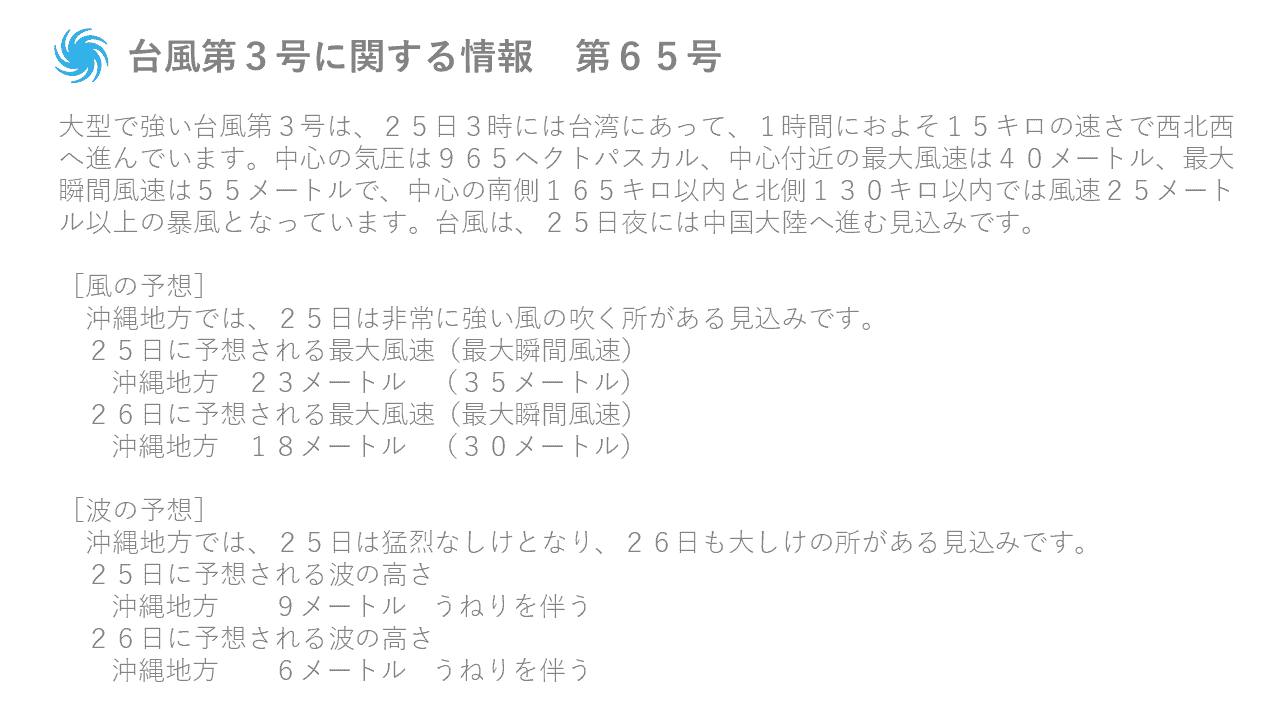 気象庁から発表される全般台風情報は、台風の位置・速度・予想進路などを示す「気象概況」、最大風速・最大瞬間風速などを示す「風の予想」、波の高さやうねりの有無を示す「波の予想」、予想される降水量や雨の降り方を示す「雨の予想」、防災上の留意事項や補足事項等をご確認いただけます。