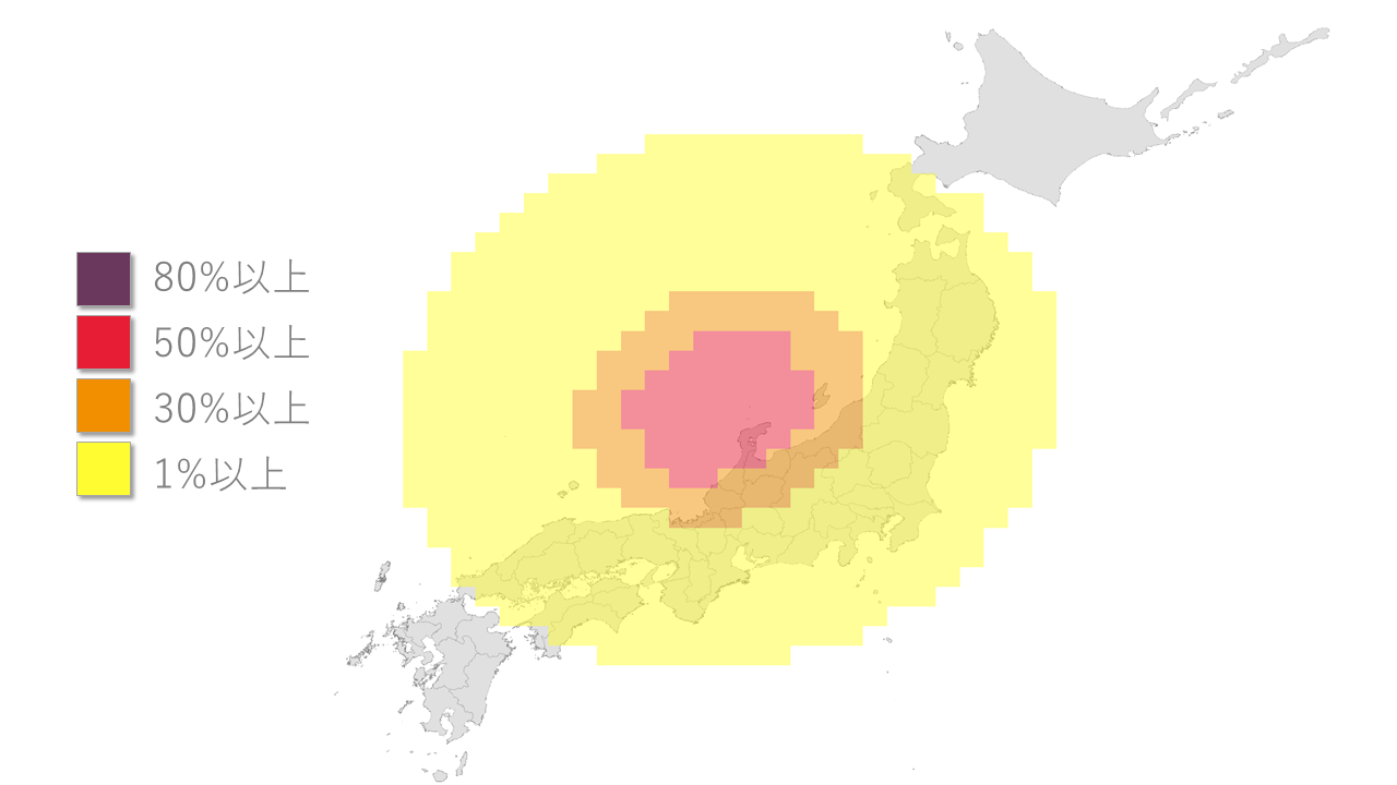 台風が発生している際に、特定の地域において暴風域に入る可能性を示した指標です。台風情報で台風の進路や勢力は確認できますが、暴風域に入る確率も加えて確認することでより適切な防災対策を講じたり、暴風や大雨などによる被害を軽減するためにお役立ていただけます。