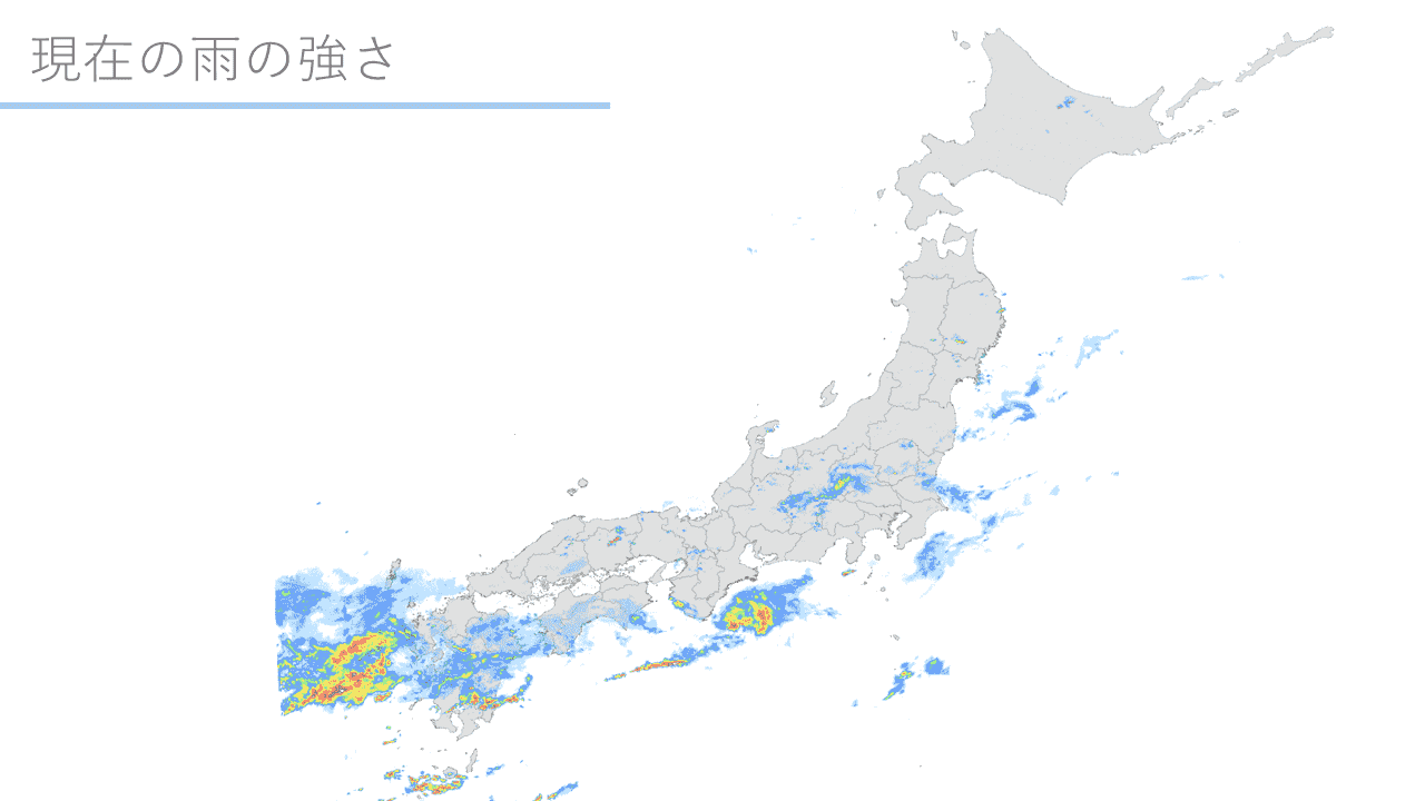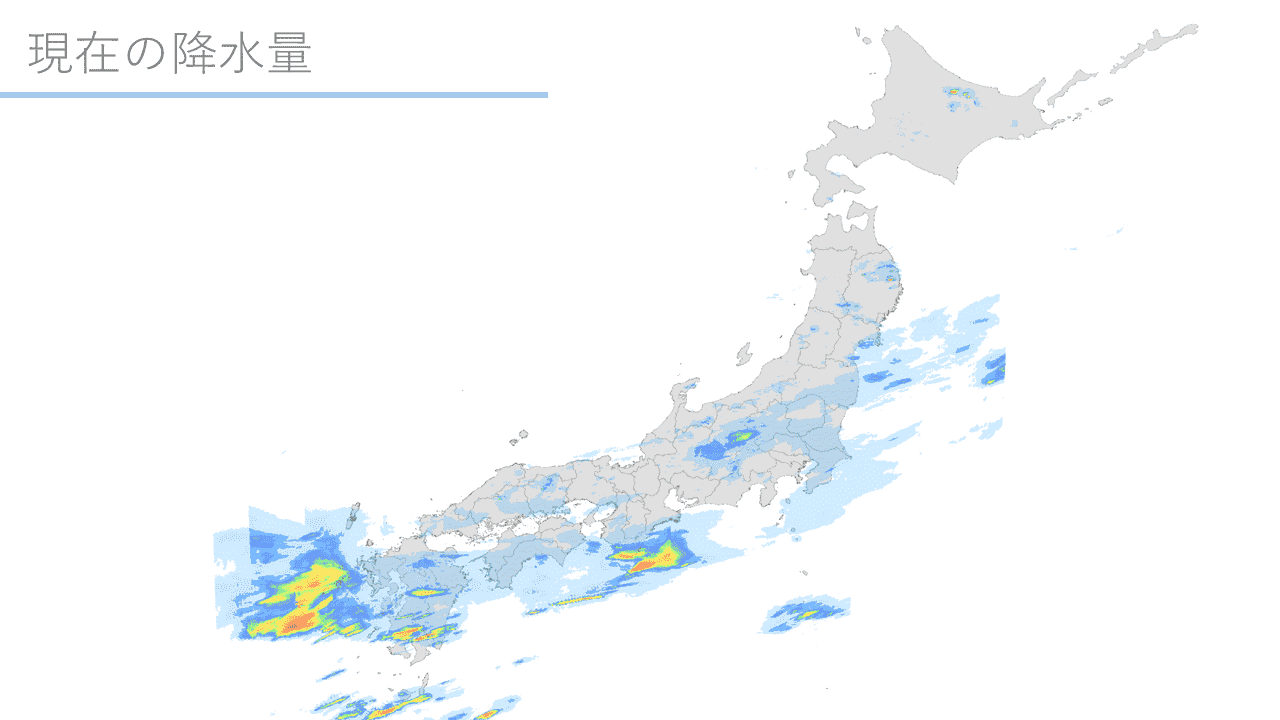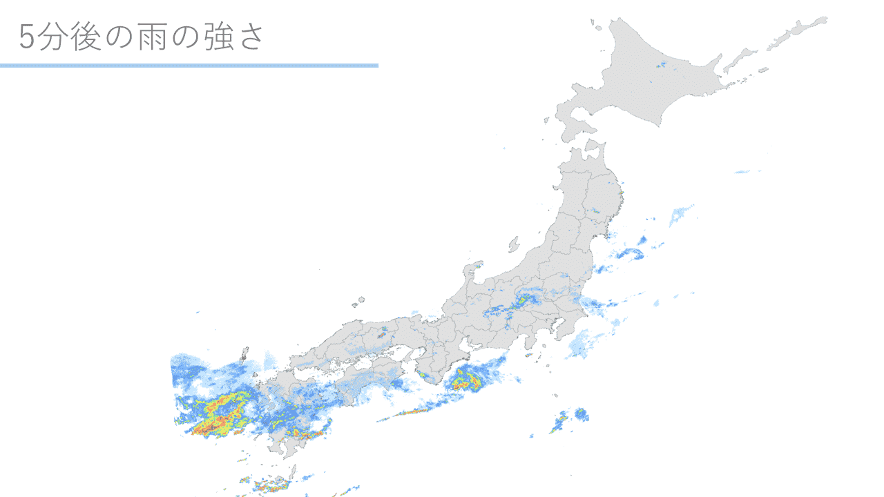 気象レーダーで観測した全国1kmメッシュの降水強度です。複数の気象レーダーによる観測データを利用することで、高精度な雨の分布状況を提供しております。降水ナウキャストと組み合わせることで、現在から1時間先まで、5分毎の降水強度の分布をご確認いただけます。