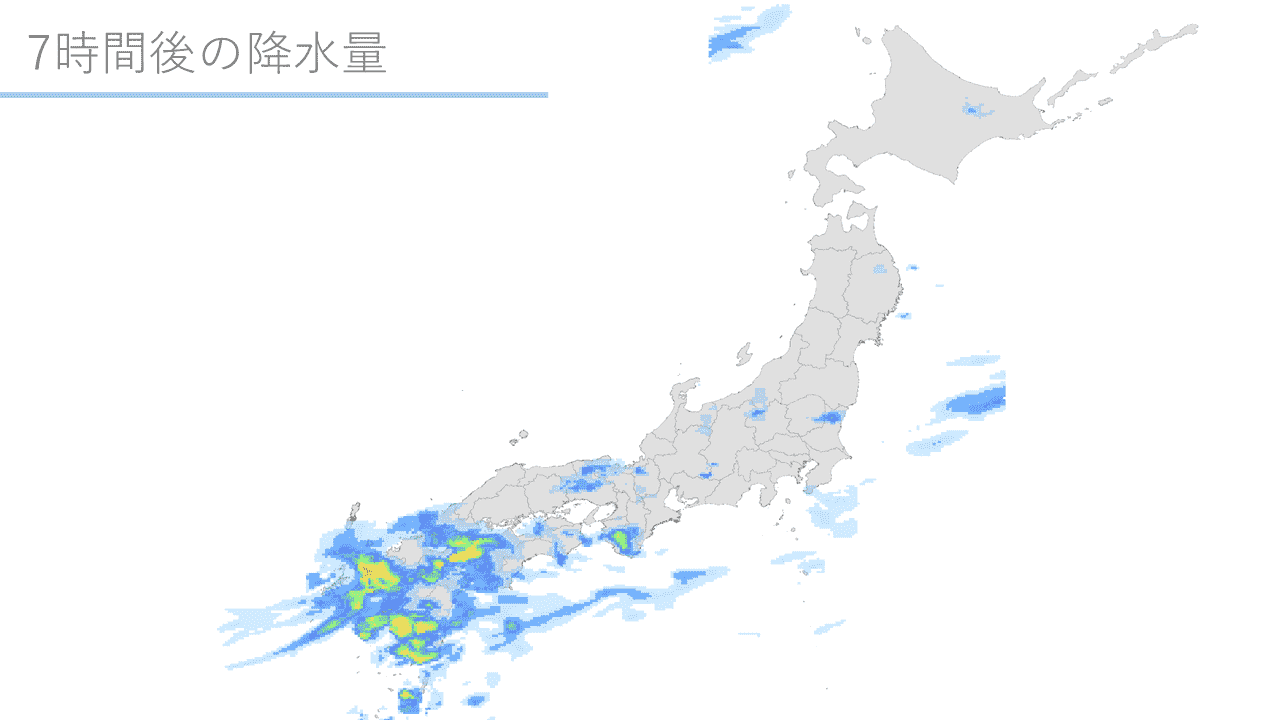 7時間先から15時間先までの全国1kmメッシュの1時間降水量の分布を提供いたします。6時間先までの予報とは異なり、複数の数値予報を統計処理することで降水量の分布を予測しております。解析雨量・降水短時間予報と組み合わせることで、現在から15時間先までの降水量の分布をご確認いただけます。