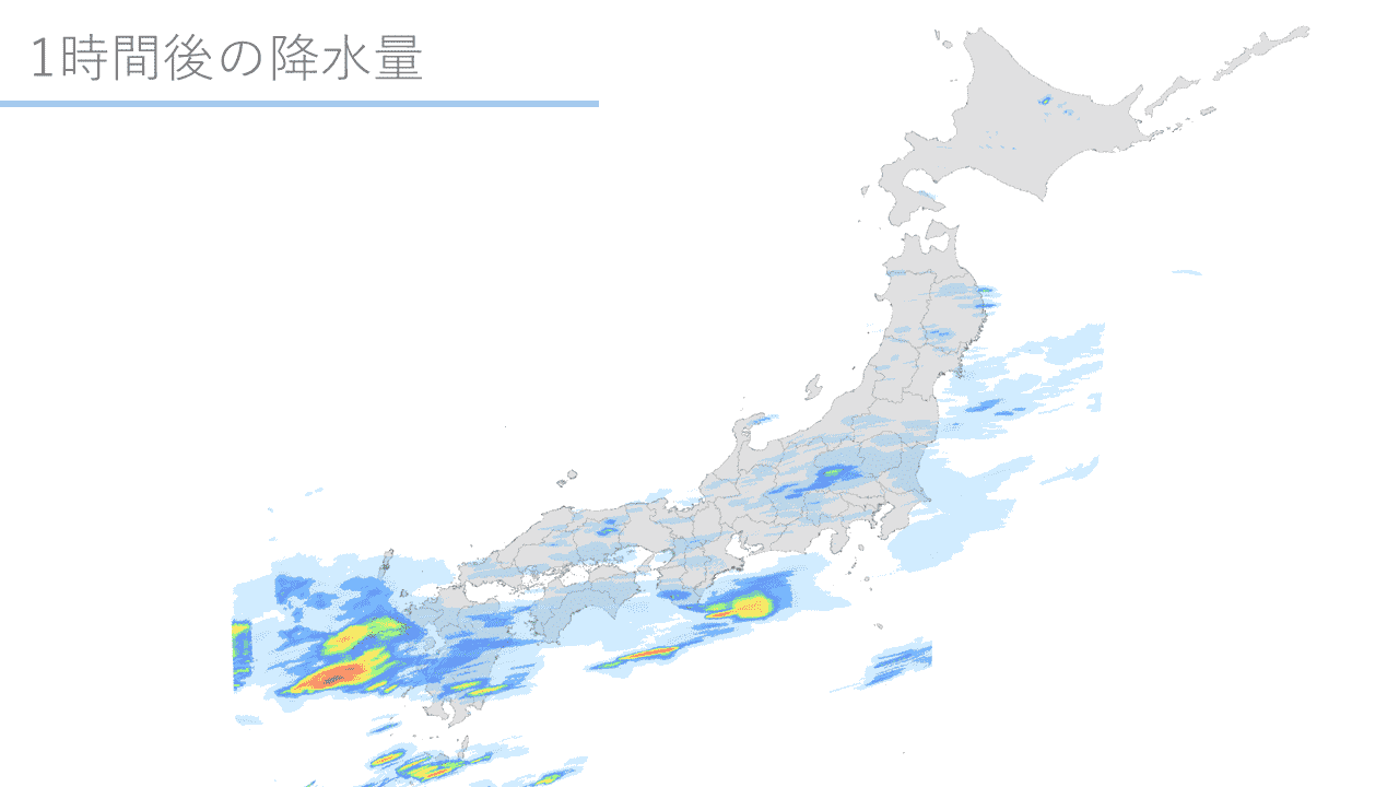 1時間先から6時間先までの全国1kmメッシュの1時間降水量の分布を提供いたします。降水域の移動速度や数値予報を使って6時間先までの降水量の分布を予測しております。解析雨量・降水15時間予報と組み合わせることで、現在から15時間先までの降水量の分布をご確認いただけます。
