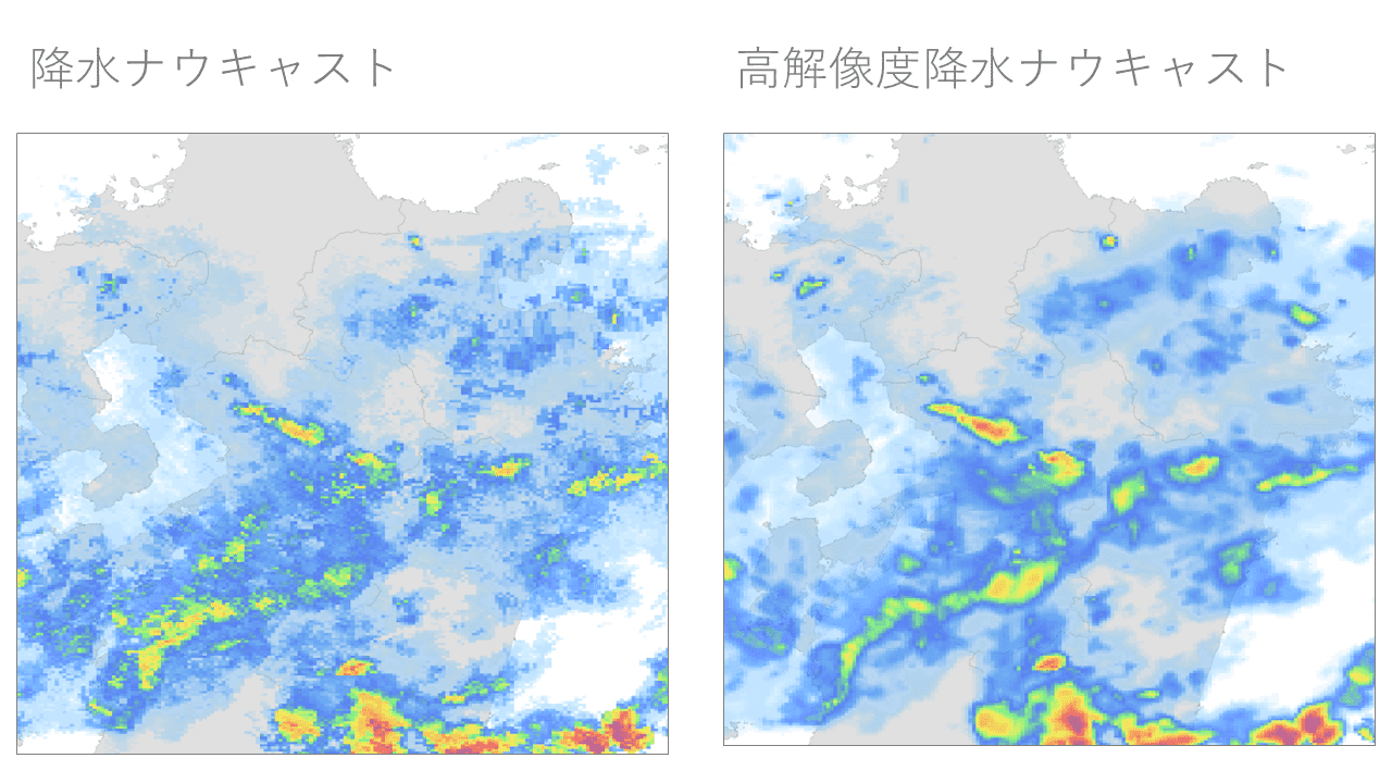 現在から60分先までの降水強度の予報です。降水ナウキャストの高解像度版であり250mメッシュの予報を提供いたします(30分より先の予測および陸から離れた海上については1kmの解像度となります)。気象レーダー観測に基づく5分毎の高精度な予報であり、急激な雨雲の発生・発達なども把握することができます。