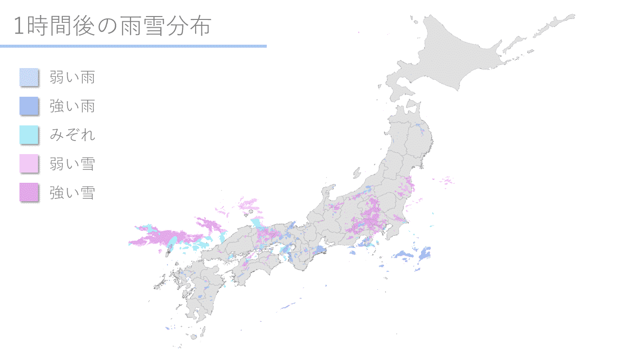 高解像度降水ナウキャストに降水種別を追加した情報です。1時間先までの降水強度に加えて、雨・みぞれ・雪などの情報を併せて把握することができます。降水ナウキャストの高解像度版であり250mメッシュの予報を提供いたします(30分より先の予測、海上については1kmの解像度となります)。