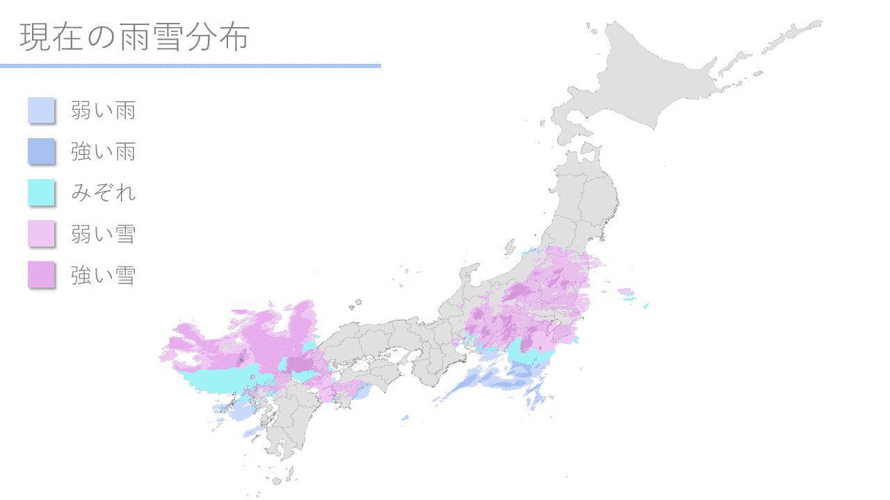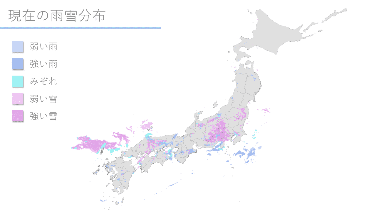解析雨量に降水種別を追加した情報です。最新の降水量に加えて、雨・みぞれ・雪などの情報を併せて把握することができます。雨雪版降水短時間予報・雨雪版降水15時間予報と組み合わせることで、現在から15時間先までの降水量と降水種別の分布をご確認いただけます。