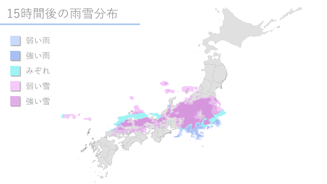 降水15時間予報に降水種別を追加した情報です。7時間先から15時間先までの降水量に加えて、雨・みぞれ・雪などの情報を併せて把握することができます。雨雪版解析雨量・雨雪版降水短時間予報と組み合わせることで、現在から15時間先までの降水量と降水種別の分布をご確認いただけます。