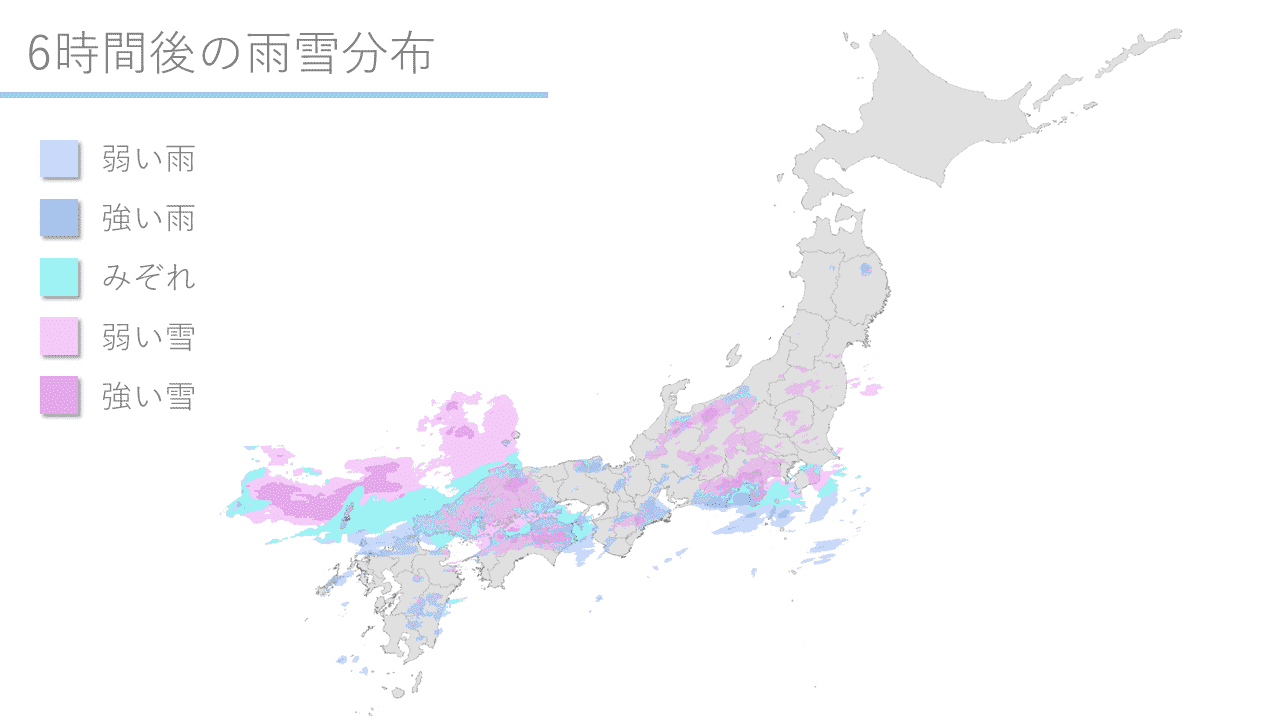 降水短時間予報に降水種別を追加した情報です。1時間先から6時間先までの降水量に加えて、雨・みぞれ・雪などの情報を併せて把握することができます。雨雪版解析雨量・雨雪版降水15時間予報と組み合わせることで、現在から15時間先までの降水量と降水種別の分布をご確認いただけます。