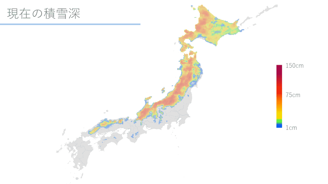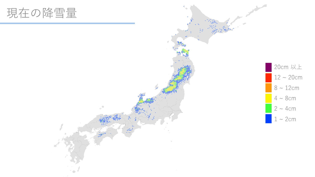 6時間先までの積雪深を5kmメッシュで提供いたします。予報では新たに積もる雪、溶ける雪、時間経過による積雪の沈み込みなどが考慮されております。積雪計による観測が行われていない地域を含めた面的な積雪深を把握することができ、雪による交通機関への影響を前もって判断するといった防災対応にご活用いただけます。