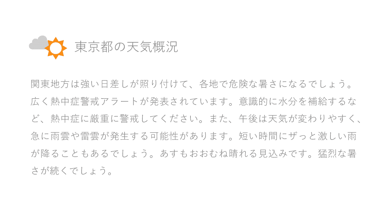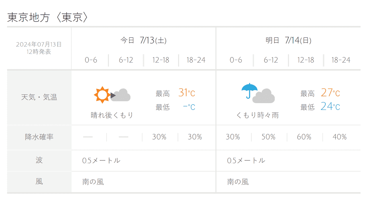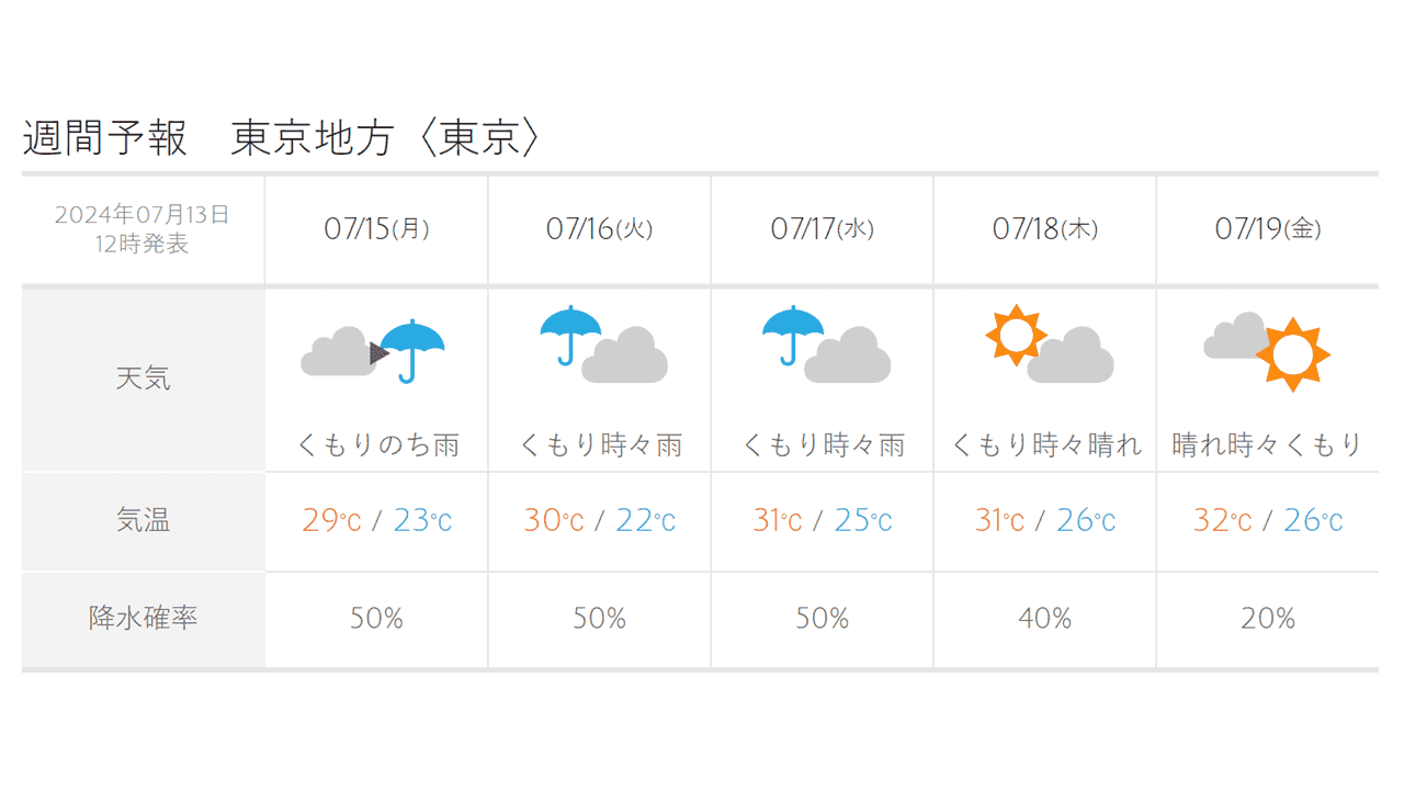 気象庁が発表する各府県予報区における1日毎の天気予報を7日先まで提供いたします。1週間先までの天気予報はもちろん、気温や降水量など様々な要素が一目で確認することができ、お出かけの予定や日常生活に役立てることができます。